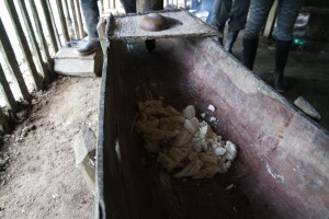 After this we start to rub the yucca, it looks a bit like to rub a radish. The rasp is not a usual one as we know. It is handmade and fixed at a half of a tree trunk. Now you can show how strong you are. Can you rub the yucca as fast as the indigene?