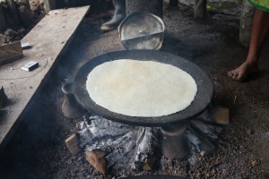 Afterward you take a bowl of this powder and place it on the hot plates of fireclay. The bowl helps you to bring it in the right form. It has to be round and thin like a big crêpe.