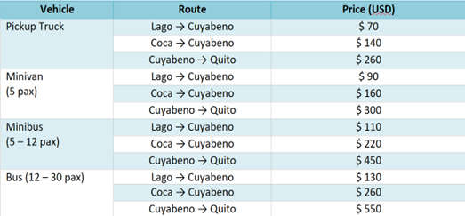 Los transfer Coca Cuyabeno demoran unas 3,5 horas; tienen un costo mínimo de $ 140 hasta 4 personas.