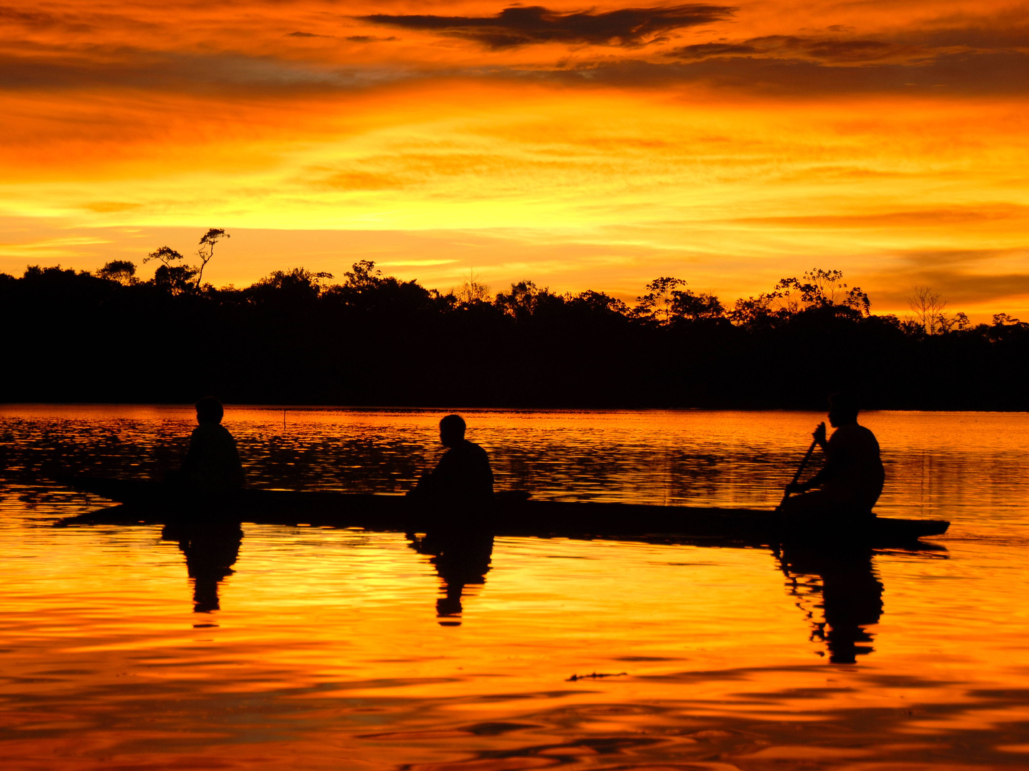 KLIMAAT ECUADOR: REGENSEIZOEN: Regenboog over de Aguarico Rivier.KLIMAAT ECUADOR: REGENSEIZOEN: Een gouden zonsondergang zegt niets over het weer voor de volgende dag.